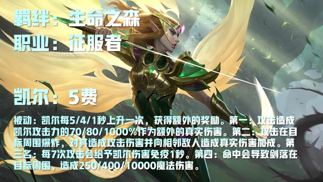 云顶之弈S5赛季即将于本月底正式上线,每一次的全新赛季都会伴随着极大的游戏改动,带给玩家非常多的惊喜... ...本期小编为大家带来的是有关于云顶之弈s5凯尔的技能及羁绊的详细介绍,欢迎大家来围观!云顶之弈s5凯尔技能及羁绊介绍凯尔5费英雄羁绊:神佑之森,圣光卫士,征服者技能:(被动)每过5/4/1秒,凯尔会升阶,获得额外效果;(被动)每过5/4/1秒,凯尔会升阶,获得额外效果!1阶:攻击额外造