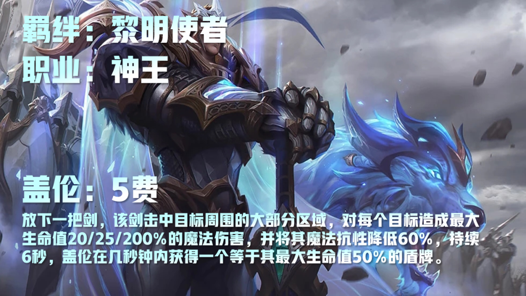 云顶之弈S5赛季即将于本月底正式上线,每一次的全新赛季都会伴随着极大的游戏改动,带给玩家非常多的惊喜... ...本期小编为大家带来的是有关于云顶之弈s5盖伦的技能及羁绊的详细介绍,欢迎大家来围观!云顶之弈s5盖伦技能及羁绊介绍盖伦5费英雄羁绊:黎明使者,神王技能:盖伦召唤神剑攻击目标周围的大范围区域,对每个敌人造成20/25/200%最大生命值的魔法伤害,并降低其60%魔抗,持续6秒。盖伦会获