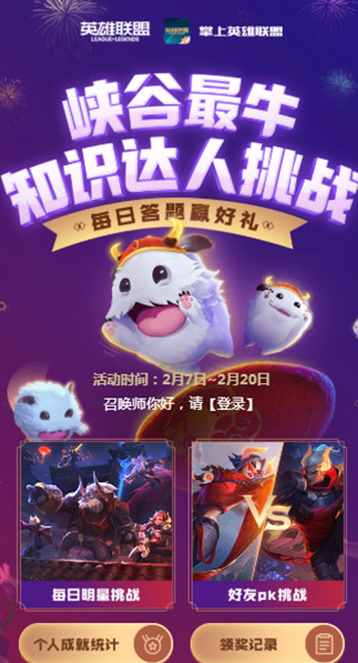 峡谷最牛知识达人挑战每天都会更新一些新题目供大家参与答题,今天是峡谷最牛知识达人挑战的最后一天,大家想知道今天的答案都有哪些吗?感兴趣的伙伴们就赶快来看看吧。峡谷最牛知识达人挑战2.20答案汇总2月7日至2月20日,峡谷最牛知识达人活动全面开启,挑战明星、PK好友,我们将在一个全新的战场迎接一场知识问答的最强挑战,战胜对手、赢取超值新春豪礼,海量福利等你来拿!LOL峡谷最牛知识达人挑战2月20日答
