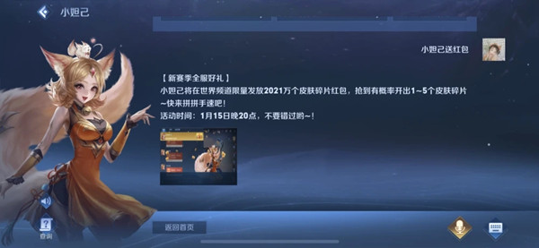 王者荣耀官方红包在哪儿领?很多的农药玩家对此还很疑惑,明明官方说是1月15日就可以领红包,但是却没有办法领... ...这究竟是怎么一回事呢?很多小伙伴不知道原因,下面就跟着小编一起来看看王者荣耀官方公告吧!王者荣耀新赛季全服好礼活动详情新赛季好礼,全服限量发放500万个皮肤碎片红包,抢到有概率开出1~5个皮肤碎片~快来拼拼手速吧!活动时间:1月15日晚20点1月15日新赛季全服好礼活动延期公告亲