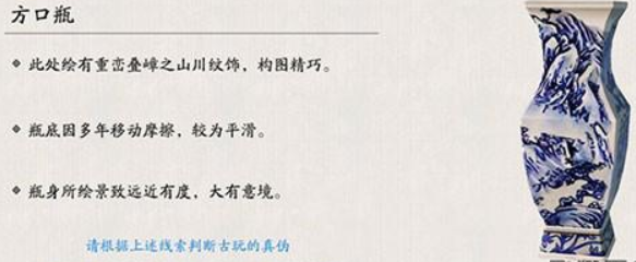 天涯明月刀手游方口瓶怎么辨别真伪?方口瓶真伪鉴定方法:天涯明月刀手游的全新版本距离公测已经过去好一段时间了,不知道大家都有体验到这款游戏的多样化游戏乐趣吗?很多的天刀玩家都想要知道天刀手游方口瓶真伪怎么鉴定的问题,下面小编就带大家一起看看天涯明月刀手游方口瓶真伪鉴定方法,希望可以帮到大家!天涯明月刀手游方口瓶真伪鉴定方法这个方口瓶主要有两个,如图所示,如果你的线索中有这三个,代表的就是真的。1、此