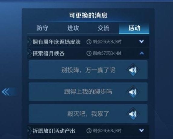 王者荣耀跟得上我的脚步吗专属语音怎么获得?跟得上我的脚步吗是王者荣耀游戏近期全新上线的一款游戏语音,游戏玩家获得语音后才能够在对局游戏中发送,并且这款语音包是限时语音,并不是一直可以使用的喔!那么,跟得上我的脚步吗专属语音怎么获得呢,可能不少喜欢农药的玩家还不太清楚,下面小编就为大家简单的介绍一下关于游戏中暗月峡谷专属语音的相关情况,希望对各位玩家有所帮助,快来看一看吧!王者荣耀暗月峡谷专属语音获