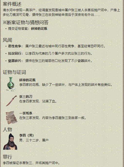 天涯明月刀李四案需要什么证据?李四案案件分析:做任何的事情都要讲究一定的方法技巧,遵循一些务必要执行的规律!对于案件来讲,掌握致命性的证据是破解案件的最直截了当的方法!不少喜欢天涯明月刀这款游戏的玩家关心的是天刀手游李四案案件怎么做,下面小编就带大家一起看看天涯明月刀手游李四案案件攻略吧!李四案案件攻略游戏介绍天涯明月刀是一款能够让玩家体验到浪漫旅行的RPG手游,在这里行侠仗义得到了完美的展示,完