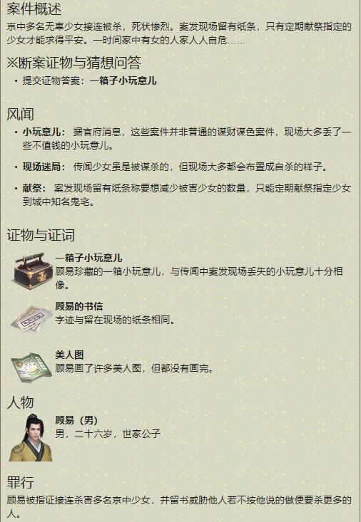 天涯明月刀顾易案案件的证据是什么?顾易是天涯明月刀这款游戏里面的一个气质儒雅的世家公子,后来被指证接连杀害多名京城少女,为了尽快的破解这个案件,下面小编就带大家一起看看天涯明月刀手游顾易案案件攻略,希望可以帮助到大家!顾易案案件攻略天涯明月刀相关推荐:天涯明月刀紫色锦鲤任务怎么做?紫色锦鲤位置在哪里?天涯明月刀手游步步生莲如何获取?天涯明月刀香兰案件的凶手是谁?香兰案件凶手揭秘