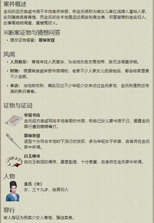 天涯明月刀金氏案的案件关键证据是什么?金氏是一个39岁的独居妇人,被指证拐卖少女入青楼强迫卖身,不少玩家关心的是天刀手游金氏案案件怎么做?下面crab就带大家一起看看天涯明月刀手游金氏案案件攻略,希望可以帮助你快速的理清思路!金氏案案件攻略天涯明月刀相关推荐:天涯明月刀永远的木头人挂件怎么获取?天涯明月刀郝连云案的关键证据是什么?天涯明月刀扑朔迷离案怎么断?扑朔迷离案案件攻略