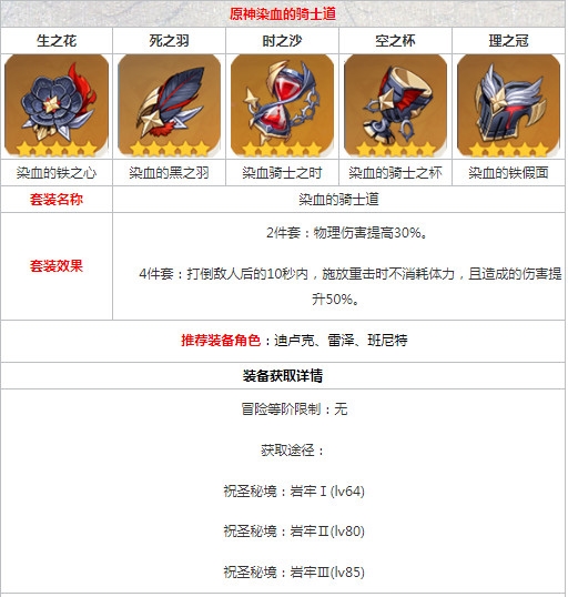 原神染血的骑士道怎么获得?原神游戏中有着多种圣遗物套装,圣遗物套装能极大的增强角色的战斗属性,集齐一定数量还能激活套装效果进一步的增强战斗能力。那么原神染血的骑士道怎么获得呢,接下里小编为大家带来这套圣遗物的获取方式和套装效果介绍,还不是很清楚的游戏晚间们接下来就跟随小编整理的文章一起来看看吧!