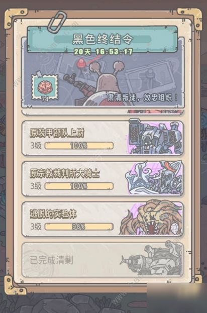 最强蜗牛黑色终结令的打发是什么?黑色终极令是游戏中一个难度较高的游戏关卡,同时有着丰厚的兑换材料奖励,最强蜗牛黑色通缉令每一个等级都有相应的BOSS可挑战哦,很多小伙伴不清楚最强蜗牛黑色终结令怎么打,下面就给大家介绍一下黑色终结令清剿攻略,感兴趣的玩家赶紧进来看看吧!黑色通缉令3级每个boss弱点可以查看,目前氪金党最适合的应该是科学院士(探索加速)和逃脱的试验体(进化宝箱,5-6阶肯定有缺细胞的