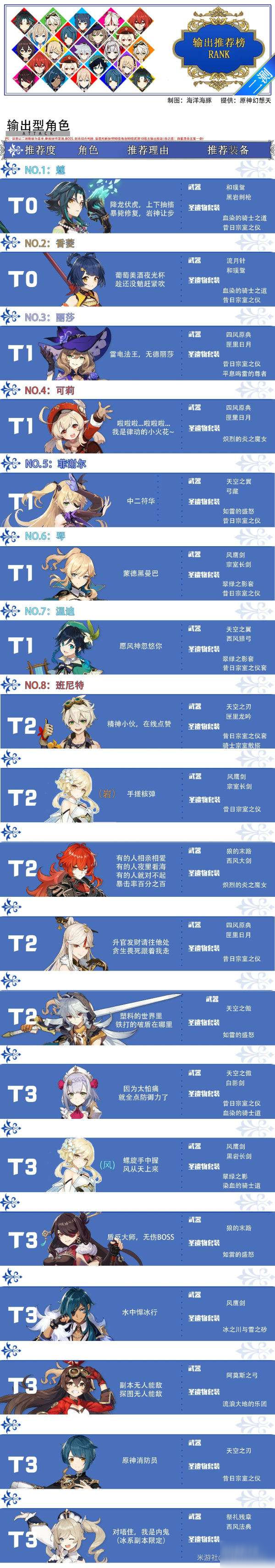 今天为大家带来关于顶级输出角色推荐的相关攻略,想要提升玩家队伍整体伤害,选择谁才是最好的出路,关于这方面的问题我们来一起看看攻略,想要完全掌握提升伤害的秘诀吗,想要将资源合理分配吗,本期攻略千万别错过!1、直接按照图片进行查找就可以了,平民也不用可以追求排行榜第一,一般T1-T2都不错的。1、主角(旅行者)印象分(女):★★★★★输出能力:★★★★防御能力/机动性:★★★★辅助/控制能力:★★★★