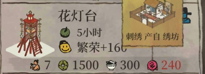 江南百景图花灯台建造的方法是什么?江南百景图花灯台怎么造?江南百景图是椰岛游戏推出的一款古风放置经营类游戏,朝代是明朝年间,玩家需要经营江南地区,可谓“我在大明当县令”,下面就一起来看看江南百景图花灯台建造方法,希望大家喜欢!江南百景图花灯台建造方法一、建造材料花灯台的分别是7个工人、1500个铜币、300碗饭以及240个刺绣,在应天府是没有刺绣的,需要通过苏州府运送过来才可以。所以玩家们需要到苏