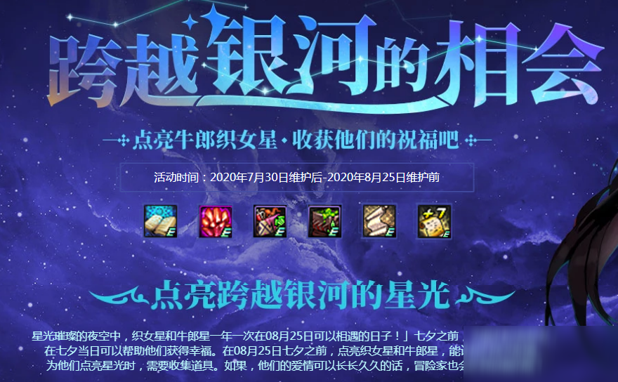 DNF手游跨越银河的相会活动怎么玩?DNF跨越银河的相会活动即将开启,很多小伙伴不清楚DNF手游跨越银河的相会活动怎么玩,下面就跟小编一起来看一看吧!【DNF2020年活动大全 】跨越银河的相会活动活动时间:20.07.30~20.08.25活动奖励:DNF相关攻略推荐:DNF牛郎星的光辉如何?DNF牛郎星的光辉详细介绍DNF弹药三觉技能如何加点?DNF弹药三觉技能加点攻略介绍DNF手游稀有装扮如