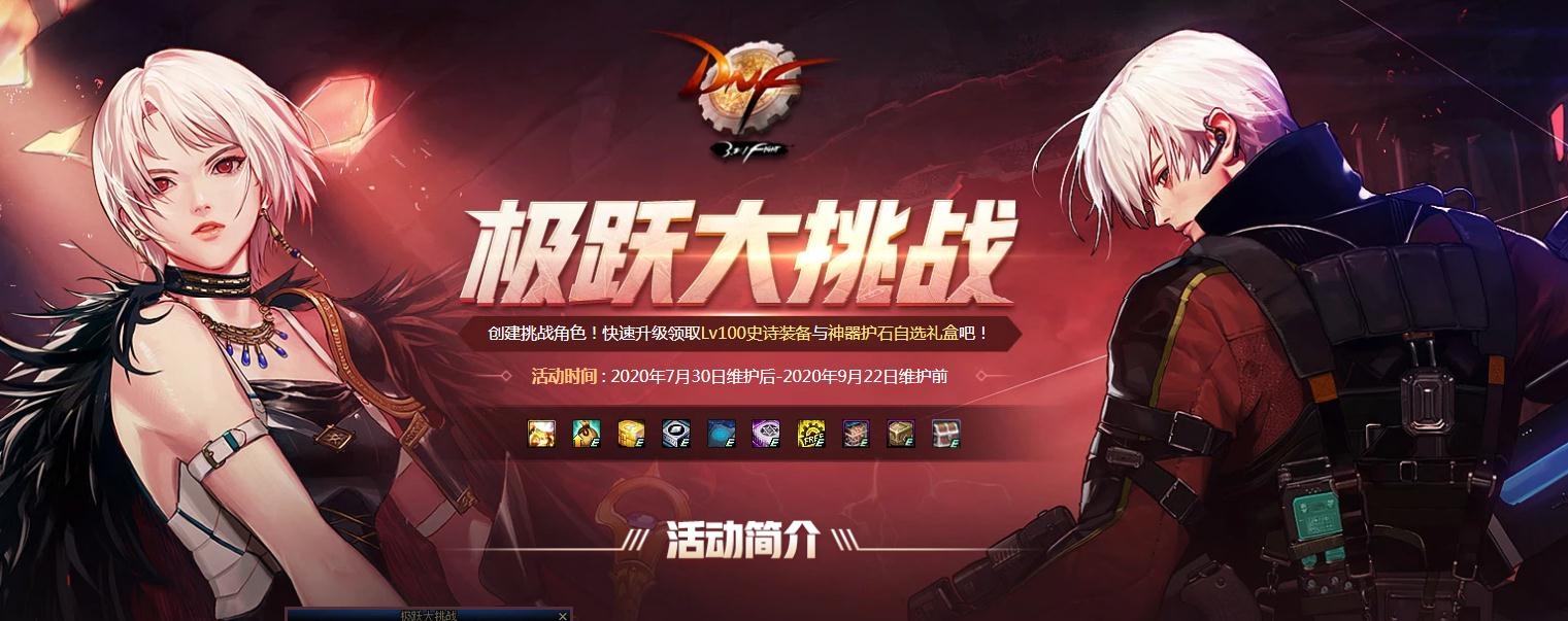 DNF极跃大挑战活动的开始时间是什么时候?DNF极跃大挑战活动什么时候开始?这是DNF7月30日上线的新活动之一,那么这个活动什么时候开始呢?小编这里带来了DNF极跃大挑战活动介绍,想要参与活动领取奖励的玩家们可不要错过了哦!活动起始时间:2020.7.30-2020.9.22活动玩法介绍:活动期间,每个账号都可以建立1个新角色作为挑战角色,挑战角色达到等级就会得到各种奖励。不建立新角色也可以指定