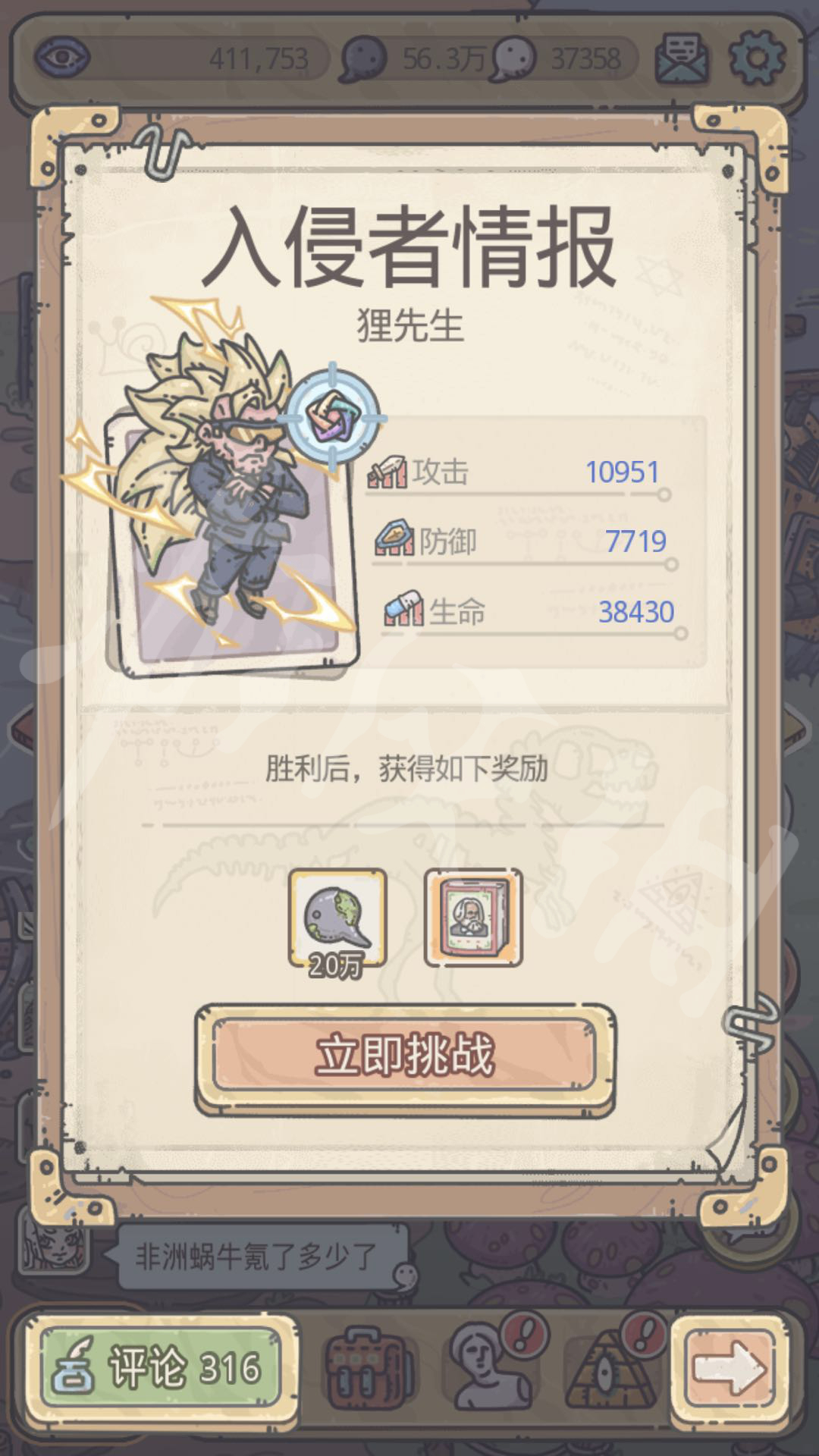 最强蜗牛狸先生奖励的具体内容是什么?不思议迷宫研发组厦门青瓷数码新推出一款放置养成类游戏叫最强蜗牛,很多玩家还不清楚里面的玩法,下面就是最强蜗牛狸先生打死给什么,来一起看看最强蜗牛狸先生奖励一览,希望能帮到大家!最强蜗牛狸先生奖励一览一、狸先生战力攻击:10951防御:7719生命:38430属性不高,装备好的话30w无压力过。没有氪金装备就40w稳定过。二、狸先生奖励1.掉落奖励ss橙贵资本论。