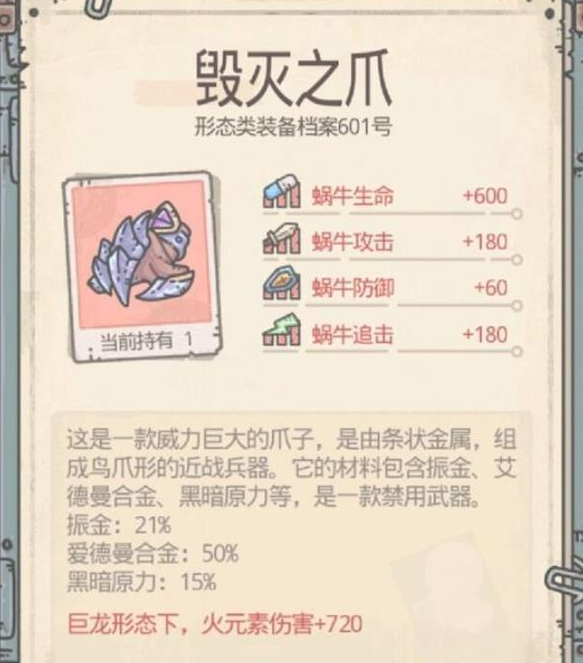 最强蜗牛毁灭之爪的获得方法是什么?在最强蜗牛手游中获取毁灭之爪的方法是什么?毁灭之爪是一种近战型武器,想要获取的玩家。那么下面我们就一起来看看关于最强蜗牛毁灭之爪获得方法吧!最强蜗牛毁灭之爪获得方法红龙爪获取途径是15颗龙珠的彩蛋,原力剑大家都知道,截杀1号获得。原力剑也是比较推荐升级的,过图神器,实在抽不到神装的非酋们,原力升红过图一样强力!最强蜗牛相关攻略推荐:最强蜗牛猫罐头位置具体在哪里?最