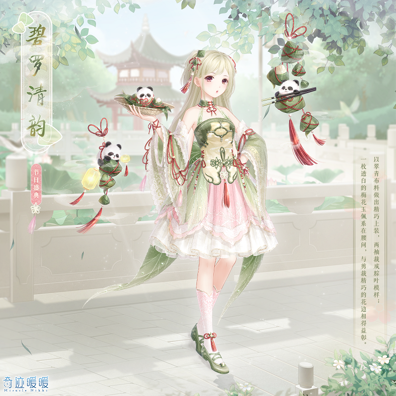 奇迹暖暖碧罗清韵套装图文一览:奇迹暖暖碧罗清韵套装怎么样?碧罗清韵套装是端午节活动中的奖励,想要获取的玩家,下面和小编一起来看看奇迹暖暖碧罗清韵套装图文一览介绍吧!奇迹暖暖碧罗清韵套装图文一览获取途径:端午节活动获取以翠青布料做出精巧上装,两袖裁成粽叶模样;一枚透白的梅花玉佩系在腰间,与剪裁精巧的花边相得益彰。【碧罗清韵】含正常姿势与特殊姿势,特殊姿势外套“碧罗清韵”,精美可移动摆件“香粽玲珑”,