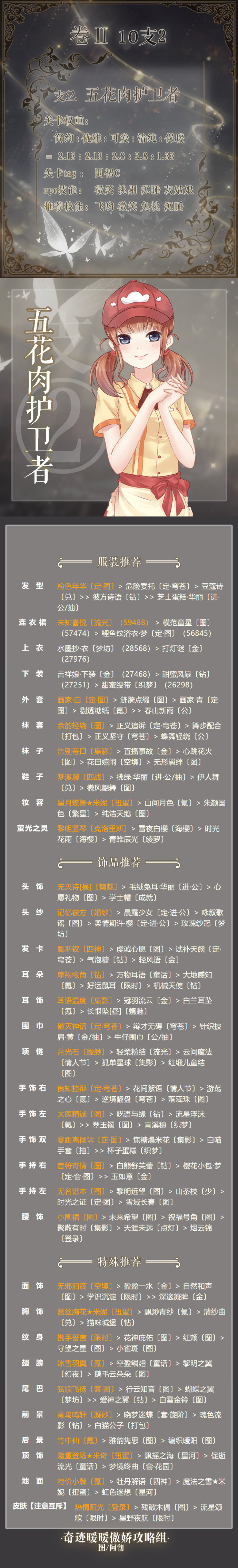 奇迹暖暖第二卷第十章支线二搭配推荐:奇迹暖暖卷2第10章支线2五花肉护卫者怎么搭配得高分?奇迹暖暖第二卷第十章已经上线了,小编今天带来了奇迹暖暖第2卷第10章支线2高分搭配攻略,想要参考的玩家们就来看看吧!奇迹暖暖第2卷第十章支线二怎么搭配关卡权重:简约:优雅:可爱:清纯:保暖=2.13:2.13:2.8:2.8:1.33关卡tag:围裙Cnpc技能:微笑 挑剔 沉睡 灰姑娘推荐技能:飞吻 微笑