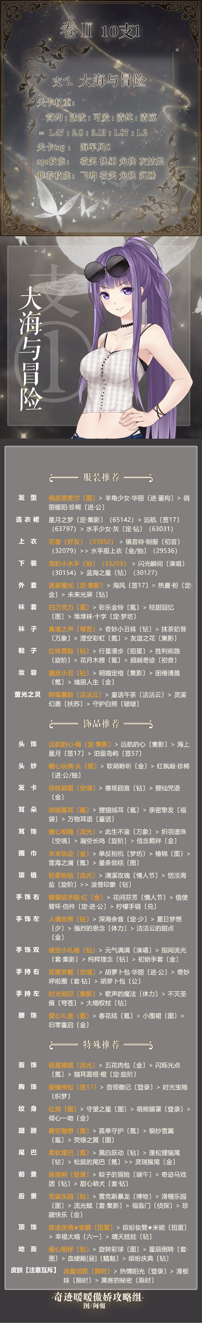 奇迹暖暖第二卷第十章支线一搭配推荐:奇迹暖暖卷2第10章支线1大海与冒险怎么搭配得高分?奇迹暖暖第二卷第十章已经上线了,小编今天带来了奇迹暖暖第2卷第10章支线1高分搭配攻略,想要参考的玩家们就来看看吧!奇迹暖暖第二卷第十章支线一怎么搭配奇迹暖暖第2卷第十章支线一高分搭配攻略关卡权重:简約:活泼:可爱:清纯:清凉=1.47:2.8:3.13:1.87:1.2关卡tag:海军风Cnpc技能:微笑 挑
