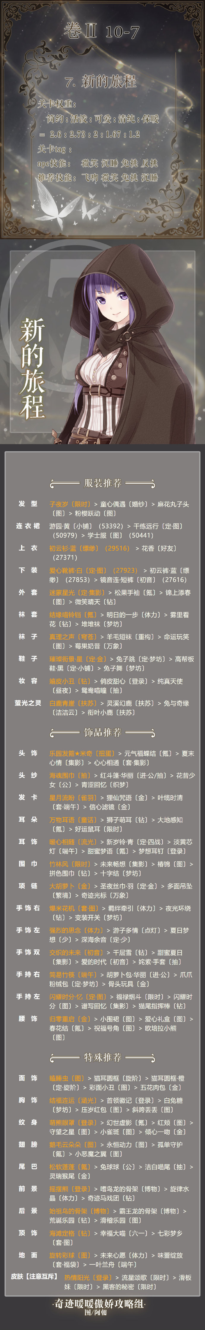 奇迹暖暖第二卷10-7搭配推荐:奇迹暖暖卷二10-7新的旅程怎么搭配得高分?奇迹暖暖第二卷第十章已经上线了,小编今天带来了奇迹暖暖第2卷10-7高分搭配攻略,想要参考的玩家们就来看看吧!奇迹暖暖第二卷10-7怎么搭配关卡权重:简约:活泼:可爱:清纯:保暖=2.6:2.73:2:1.67:1.2关卡tag:npc技能:微笑 沉唾 免挑 反挑推荐技能:飞吻 微笑 免挑 沉睡奇迹暖暖相关攻略推荐:奇迹暖