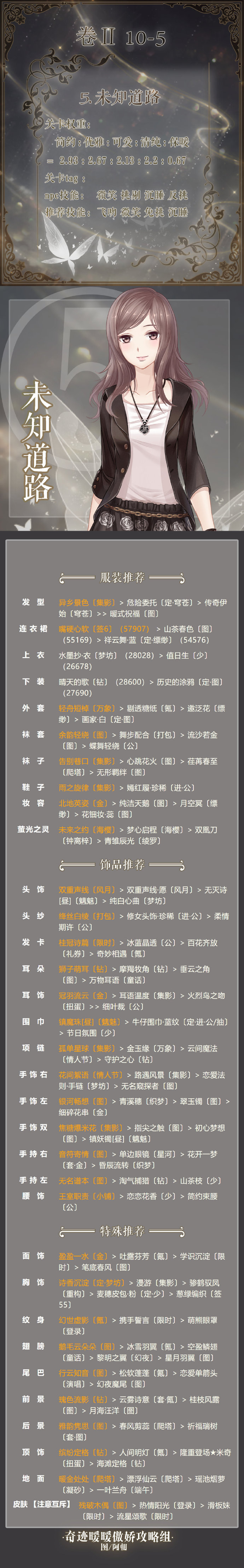 奇迹暖暖第二卷10-5搭配推荐:奇迹暖暖卷二10-5未知道路怎么搭配得高分?奇迹暖暖第二卷第十章已经上线了,小编今天带来了奇迹暖暖第2卷10-5高分搭配攻略,想要参考的玩家们就来看看吧!奇迹暖暖第2卷10-5怎么搭配关卡权重:简约:优雅:可爱:清纯:保暖=2.93:2.67:2.13:2.2:0.67关卡tag:npc拔能:微笑 挑剔 沉睡 反挑推荐技能:飞吻 微笑 免挑 沉睡奇迹暖暖相关攻略推荐