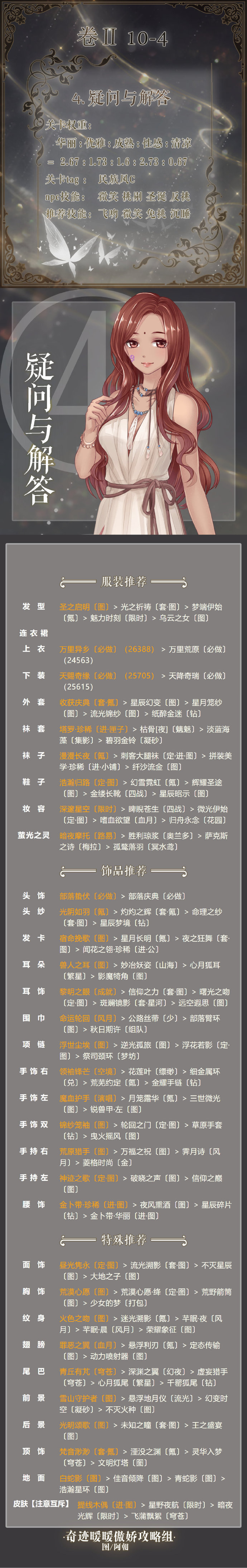 奇迹暖暖第二卷10-4搭配推荐:奇迹暖暖卷二10-4疑问与解答怎么搭配得高分?奇迹暖暖第二卷第十章已经上线了,小编今天带来了奇迹暖暖第2卷10-4高分搭配攻略,想要参考的玩家们就来看看吧!奇迹暖暖第2卷10-4怎么搭配关卡权重:华丽:优雅:成熟:性感:清凉=2.67:1.73:1.6:2.73:0.67关卡tag:民族风Cnpc技能:微笑 挑剔 圣诞 反挑推荐技能:飞吻 微笑 免挑 沉睡奇迹暖暖相
