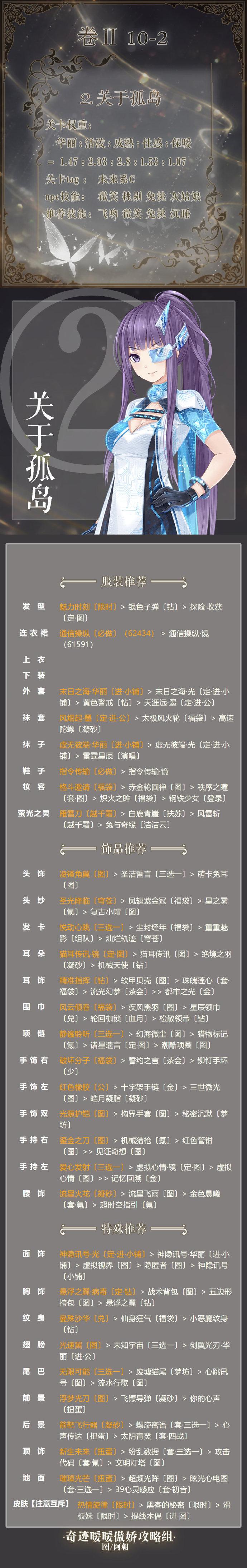 奇迹暖暖第二卷10-2搭配推荐:奇迹暖暖卷二10-2关于孤岛怎么搭配得高分?奇迹暖暖第二卷第十章已经上线了,小编今天带来了奇迹暖暖第2卷10-2高分搭配攻略,想要参考的玩家们就来看看吧!奇迹暖暖第2卷10-2怎么搭配关卡权重:华丽:活泼:成熟:性感:保暖=1.47:2.93:28;1.58: 1.07关卡tag:未来系Cnpe技能:微笑 挑剔 免挑 灰姑娘推荐技能:飞吻 微笑 免挑 沉睡奇迹暖暖相