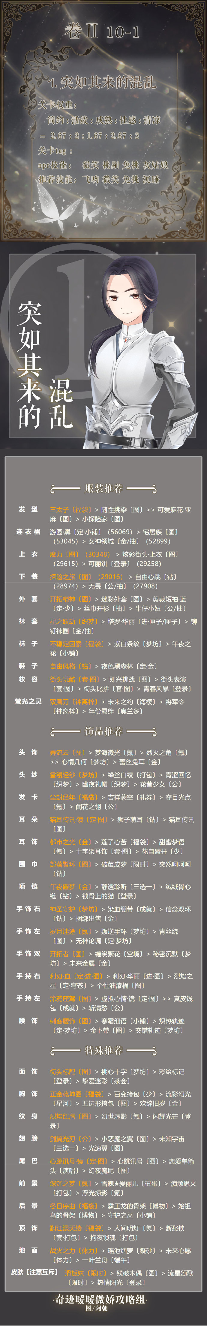 奇迹暖暖第二卷10-1搭配推荐:奇迹暖暖卷二10-1突如其来的混乱怎么搭配得高分?奇迹暖暖第二卷第十章已经上线了,小编今天带来了奇迹暖暖第2卷10-1高分搭配攻略,想要参考的玩家们就来看看吧!奇迹暖暖第2卷10-1怎么搭配关卡权重:简约:活泼:成熟:性感:清凉=2.67:2:1.67:2.67:2关卡tag:npc技能:微笑挑剔免挑灰姑娘推荐技能:飞吻微笑免挑沉唾奇迹暖暖相关攻略推荐:奇迹暖暖第二