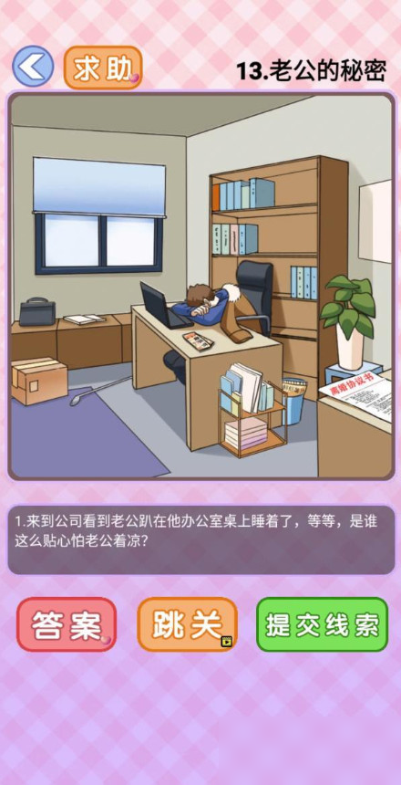 你有问题第13关怎么通关?你有问题这款游戏的趣味性还是比较高的,可以让各位有对象的小伙伴们分辨出自己的男女关系,你有问题第13关怎么通关?我们一起来看看做你有问题第13关通关攻略!指路→《你有问题》全关卡通关攻略大全你有问题第13关怎么过题目:来到公司看到老公趴在他办公室桌上睡着了,等等,是谁这么贴心怕老公着凉?正确操作:依次点击提交男人背上的衣服、垃圾桶、桌上的音乐券、右下角的离婚协议书!