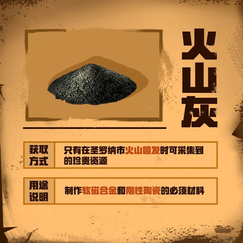 明日之后圣罗纳市火山灰获得方法是什么?明日之后圣罗纳市火山灰怎么样?相关的特产介绍小编已经为大家准备好了。那么接下来,就跟随小编一起继续往下看,感兴趣的小伙伴一定不要错过啦!明日之后圣罗纳市火山灰怎么获得圣罗纳市火山灰介绍:圣罗纳市10级地图特产。火山爆发后挖掘熔岩有几率获得。获取方式:只有在圣罗纳市火山喷发时可以采集到的珍贵资源。用途说明:制作软磁合金和刚性陶瓷的必须材料!