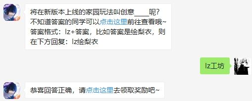 将在新版本上线的家园玩法叫创意_____呢?这是龙族幻想手游2020年4月23日微信每日一题的问题,回答正确可以获得天天抽好礼的机会,大家知道今天每日一题的答案吗?2020年龙族幻想4月23日每日一题问题将在新版本上线的家园玩法叫创意_____呢?不知道答案的同学可以点击这里前往查看哦~答案格式:lz+答案,比如答案是绘梨衣,则在下方回复:lz绘梨衣2020年龙族幻想4月23日每日一题答案lz工坊
