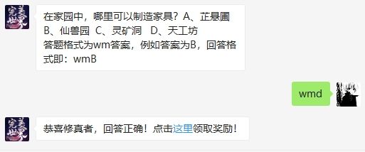 在家园中,哪里可以制造家具?这是2020年完美世界手游微信公众号4月23日每日一题的问题,各位完美世界手游玩家知道这个问题的答案吗?答对可以在完美世界手游微信公众号中进行抽奖!2020年完美世界手游4月23日微信每日一题问题在家园中,哪里可以制造家具?A、芷悬圃 B、仙兽园 C、灵矿洞 D、天工坊答题格式为wm答案,例如答案为B,回答格式即:wmB2020年完美世界手游4月23日微信每日一题答案w