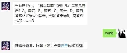 当前游戏中,“科举答题”活动是在每周几开启?这是2020年完美世界手游微信公众号4月26日每日一题的问题,各位完美世界手游玩家知道这个问题的答案吗?答对可以在完美世界手游微信公众号中进行抽奖!2020年完美世界手游4月26日微信每日一题问题当前游戏中,“科举答题”活动是在每周几开启?A、周四 B、周五 C、周六 D、周日答题格式为wm答案,例如答案为B,回答格式即:wmB2020年完美世界手游4月