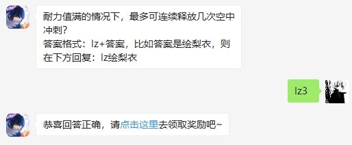 耐力值满的情况下,最多可连续释放几次空中冲刺?这是龙族幻想手游2020年4月14日微信每日一题的问题,回答正确可以获得天天抽好礼的机会,大家知道今天每日一题的答案吗?还不知道这个问题答案的小伙伴,赶紧跟随小编一起来看看吧!2020年龙族幻想4月14日每日一题问题耐力值满的情况下,最多可连续释放几次空中冲刺?答案格式:lz+答案,比如答案是绘梨衣,则在下方回复:lz绘梨衣2020年龙族幻想4月14日
