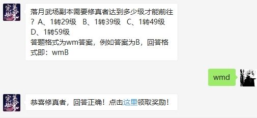 落月武场副本需要修真者达到多少级才能前往?这是2020年完美世界手游微信公众号4月16日每日一题的问题,各位完美世界手游玩家知道这个问题的答案吗?答对可以在完美世界手游微信公众号中进行抽奖,还不清楚答案的小伙伴们赶紧跟随小编一起来看看吧!2020年完美世界手游4月16日微信每日一题问题落月武场副本需要修真者达到多少级才能前往?A、1转29级 B、1转39级 C、1转49级 D、1转59级答题格式为