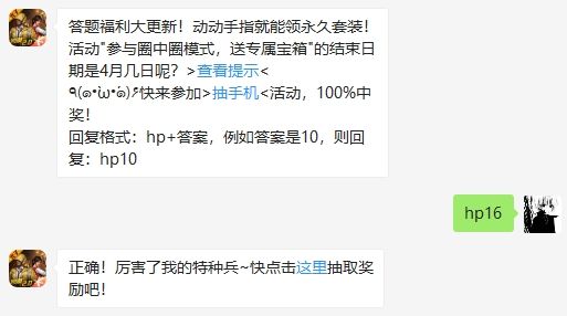 活动"参与圈中圈模式,送专属宝箱"的结束日期是4月几日呢?和平精英4月16日答题抽奖答案