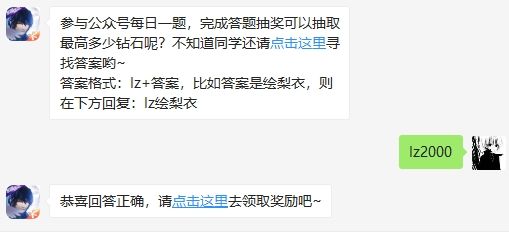 参与公众号每日一题,完成答题抽奖可以抽取最高多少钻石呢?这是龙族幻想手游2020年4月17日微信每日一题的问题,回答正确可以获得天天抽好礼的机会,大家知道今天每日一题的答案吗?还不知道的小伙伴们赶紧跟随小编一起来看看吧!2020年龙族幻想4月17日每日一题问题参与公众号每日一题,完成答题抽奖可以抽取最高多少钻石呢?不知道同学还请点击这里寻找答案哟~答案格式:lz+答案,比如答案是绘梨衣,则在下方回
