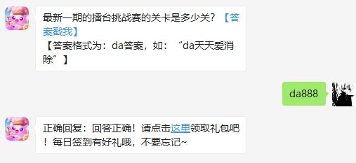 最新一期的擂台挑战赛的关卡是多少关?这是2020年天天爱消除4月17日微信每日一题的问题,答对可获得天天爱消除每日一题幸运扭蛋机抽奖资格,可获得积分、金币和宠物等好礼,大家知道今天的答案吗?还不清楚的小伙伴们,赶紧跟随小编一起来看看吧!2020年天天爱消除4月17日微信每日一题问题最新一期的擂台挑战赛的关卡是多少关?【答案戳我】【答案格式为:da答案,如:“da天天爱消除”】2020年天天爱消除4