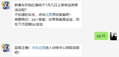 新赛车烈焰红旗将于1月几日上架幸运宾果活动呢?这是2020年1月9日跑跑卡丁车手游微信客户端超跑会答题的问题,答对问题可在训练中领取奖励,大家知道这个问题的答案吗?下面小编为大家带来了跑跑卡丁车手游1月9日微信超跑会答题答案,一起来看看吧!2020年跑跑卡丁车手游1月9日超跑会答题问题新赛车烈焰红旗将于1月几日上架幸运宾果活动呢?不知道的车友,点击这里寻找答案吧~答题格式:pp+答案;如果答案是宝