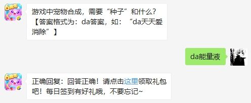 游戏中宠物合成,需要“种子”和什么?这是2020年天天爱消除1月9日微信每日一题的问题,答对可获得天天爱消除每日一题幸运扭蛋机抽奖资格,可获得积分、金币和宠物等好礼,大家知道今天的答案吗?2020年天天爱消除1月9日微信每日一题问题游戏中宠物合成,需要“种子”和什么?【答案格式为:da答案,如:“da天天爱消除”】2020年天天爱消除1月9日微信每日一题答案da能量液以上就是小编为大家带来的202