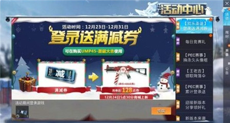 和平精英圣诞满减券怎么获得?和平精英推出了最新的圣诞节活动,玩家登陆游戏即可领取满减券。圣诞满减券有什么用呢?下面就让小编为感兴趣的小伙伴介绍一下圣诞满减券领取方法及作用吧!和平精英圣诞满减券怎么获得12月23日-12月31日,登陆游戏即可领取满减券,可在购买UMP45-圣诞大吉时使用。满减券领取方法在上图所示的页面当中用箭头标注出的红点处点进去就可以进行满减券的领取了,记得领完再买可以省钱哦。当