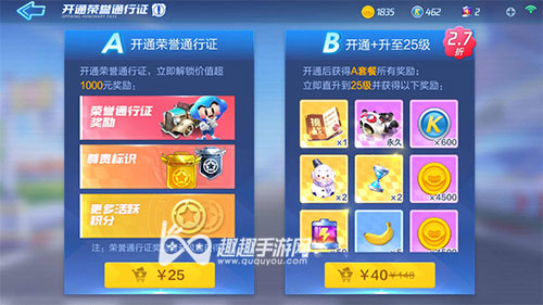 跑跑卡丁车手游玩家可以购买荣耀通行证来得到很多奖励,目前主要有A和B两种,其中A是25元,而B则是40元,这两个到底谁更划算呢?下面小编就为大家介绍一些购买的建议。 通行证购买建议: 如果按照性价比的话,肯定是25元划算,毕竟40元的虽然直接可以升级到
