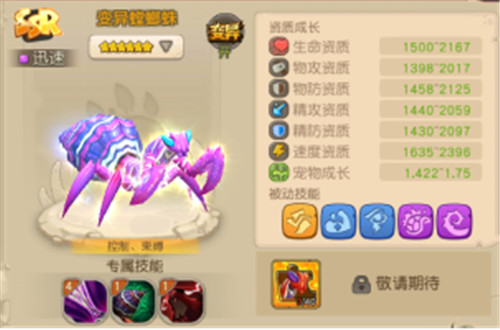 疯狂原始中螳螂蛛是一只强力的肉盾控制型宠物,很多玩家对于螳螂蛛的情况还不是很了解,下面58资源网小编就为大家介绍一下。 专属技能介绍 【蛛网】 技能效果:对目标喷射蛛网,有40%概率使其无法行动5回合,且承受所有伤害降低40%,但自身也无法行动;该技