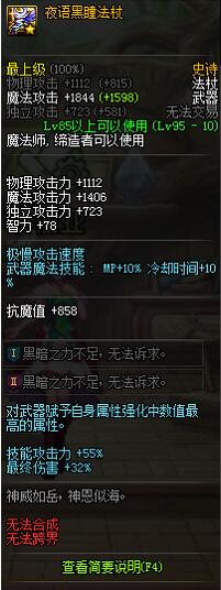 还不是很了解的玩家们,下面58免费资源网小编就为大家带来夜语黑瞳法杖属性介绍,接着往下看吧。 DNF夜语黑瞳法杖属性怎么样? 装备属性:物理攻击力 +1112魔法攻击力 +1406独立攻击力 +723智力