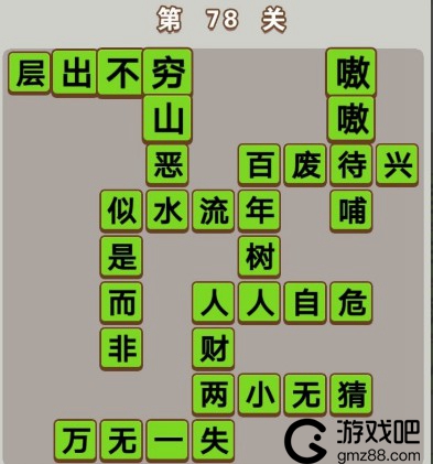 成语中状元78关里面有几个成语并不是很常见,很多玩家都被78关难住了。下面小编就为大家带来了78关的答案,一起来看看吧!成语中状元第78关答案介绍 第78关答案:层出不穷、穷山恶水、嗷嗷待哺、百年树人、百废待兴、似是而非、似水流年、人财两失、人人自危、两小无猜