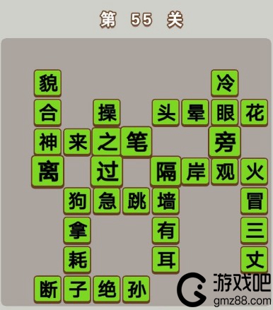 成语中状元55关大家过关了吗?玩到55关的玩家成语储备量也是挺多的了,55关考验的成语还是比较多的,下面小编就来告诉大家55关怎么过。成语中状元第55关答案介绍 第55关答案:貌合神离、冷眼旁观、操之过急、头晕眼花、神来之笔、隔墙有耳、隔岸观火、火冒三丈、狗拿