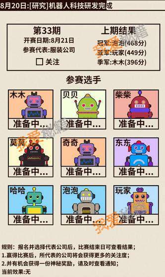 "机器人大赛"是《爸爸活下去》游戏中的一个活动玩法,玩家们参与到这个玩法当中,根据最终获得的名次,可以获得不同的奖励,下面58免费资源小编来给大家分享一下吧!爸爸活下去机器人大赛攻略及奖励介绍机器人大赛,左上角有开始时间和下届大赛开始的时间,以及你报名的公司(