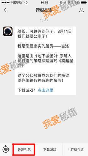 在《跨越星弧》手游中,玩家们可以使用密令兑换物品,不过有很多的玩家不知道如何获取密令,下面58免费资源小编给大家分享一下密令获取攻略。跨越星弧密令怎么获得1.进入手机微信,关注"跨越星弧"公众号,点击公众号左下方的"关注礼包"按钮。2.这样我们也可以获得一个跨