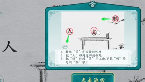 离谱的汉字是通过汉字来制作的一款游戏,大家需要通过操作汉字来顺利地通关,那么大家在游玩到让乌鸦喝水这一关的时候,如果不知道具体的游玩方法的话,可以来看看下面的攻略哦。离谱的汉字让乌鸦喝水怎么玩1、【让乌鸦喝水】首先点一下【茶】字的草字头,茶壶盖会打开2、接着把【人】往屏幕外移走,人走茶凉,这个时候乌鸦就可以喝茶了3、然后把【鸦】移动到茶上面,按住【牙】字的下半部分,可以往下拉4、拉动到茶上面之后,
