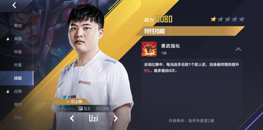 UZI这名选手大家都不陌生,在英雄联盟电竞经理当中也是可以进行招募的,大家想要来招募游玩UZI的话,要更好的培养这名选手,可以来参考以下的攻略,帮助大家了解UZI的发展方向。英雄联盟电竞经理UZI好用吗1.概况【SSR】2022春 BLG-Uzi司职位置:下路基础评分:842.英雄招牌:薇恩熟练:伊泽瑞尔丨卢锡安丨凯特琳丨卡莎3.技能【勇武强化】:全场比赛中,每当选手击败1个敌人后。自身最终增伤提