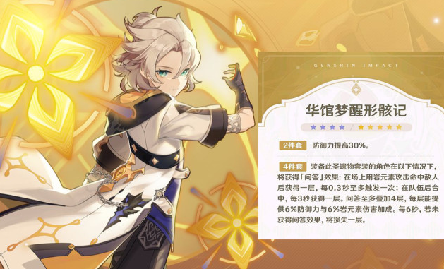 原神的2.3版本终于正式上线了,在这次的新版本里面存在着两套新的圣遗物,其中就有着这么一套名为华馆梦醒形骸记的圣遗物,那么这个名为华馆梦醒形骸记的圣遗物的套装效果是什么呢?大家赶紧来58免费资源网看看本文吧。原神圣遗物华馆梦醒形骸记效果介绍:【两件套】防御力提高30%【四件套】装备此圣遗物套装的角色在以下情况下,将获得「问答」效果:在场上用岩元素攻击命中敌人后获得一层,每0.3秒至多触发一次;在队